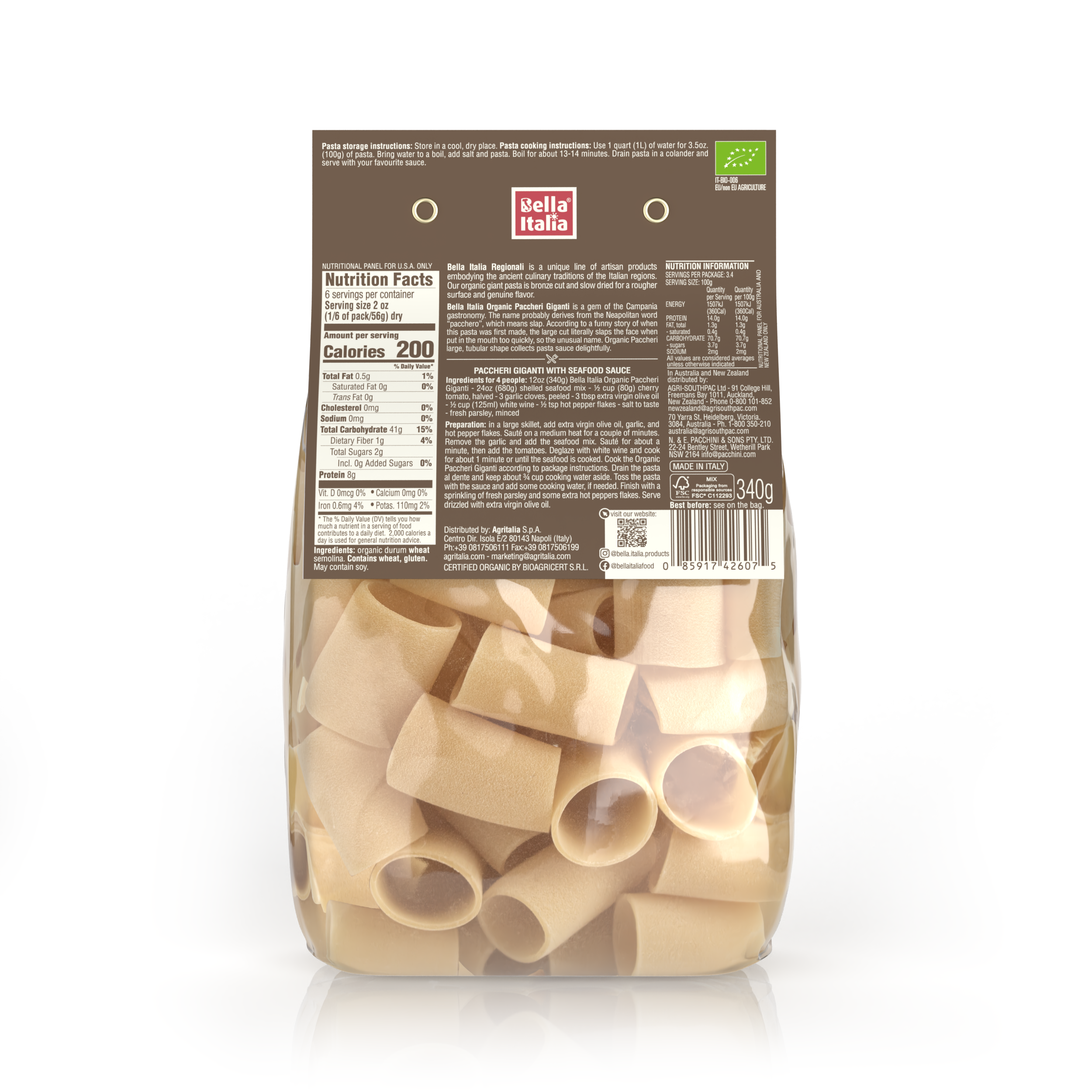 Organic Paccheri Giganti is a large-sized, wide pasta tubes. The name derives from the Neapolitan word “pacchero”, which means slap. According to a funny story of when this pasta was first made, the large cut literally slaps the face when put in the mouth too quickly, hence the unusual yet hilarious name.